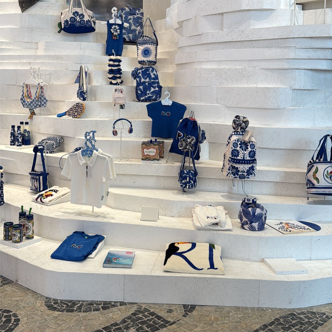 Alguns destaques: O piso de pedra portuguesa, uma arquibancada no meio da loja baseada na pedra do Arpoador, os cobogós na faixada, as cadeiras Buble e estátua em madeira de Dora, cadela de estimação de Humberto Campana.